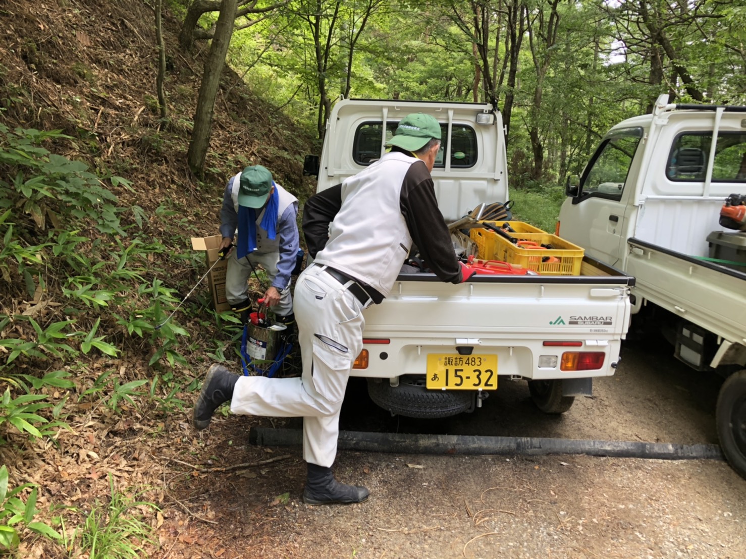 本日森林組合作業にて守屋山登山口水呑場周辺の倒木処理を行いました。また、作業終了後には豚コレラ対策の消毒をして下山しました