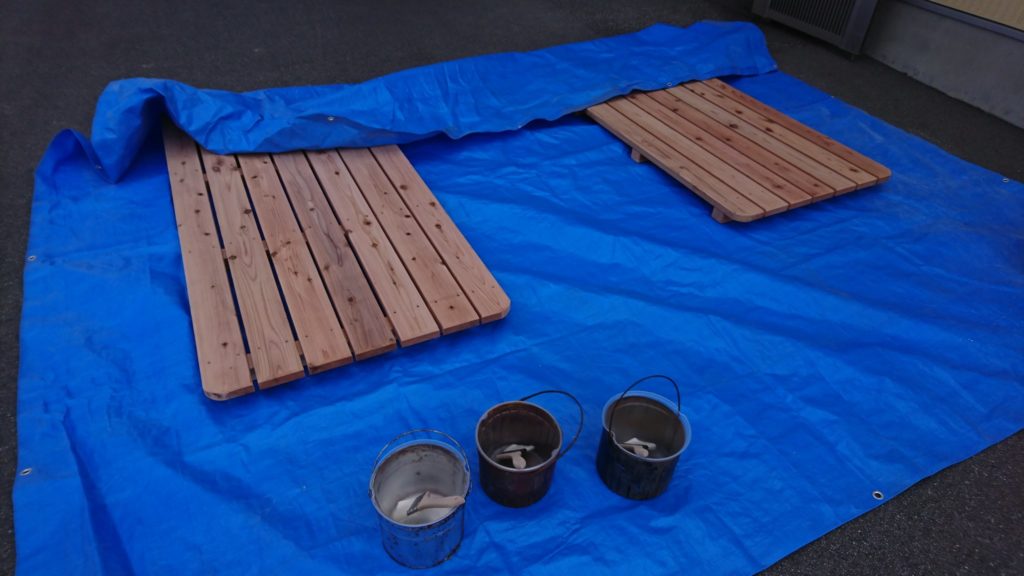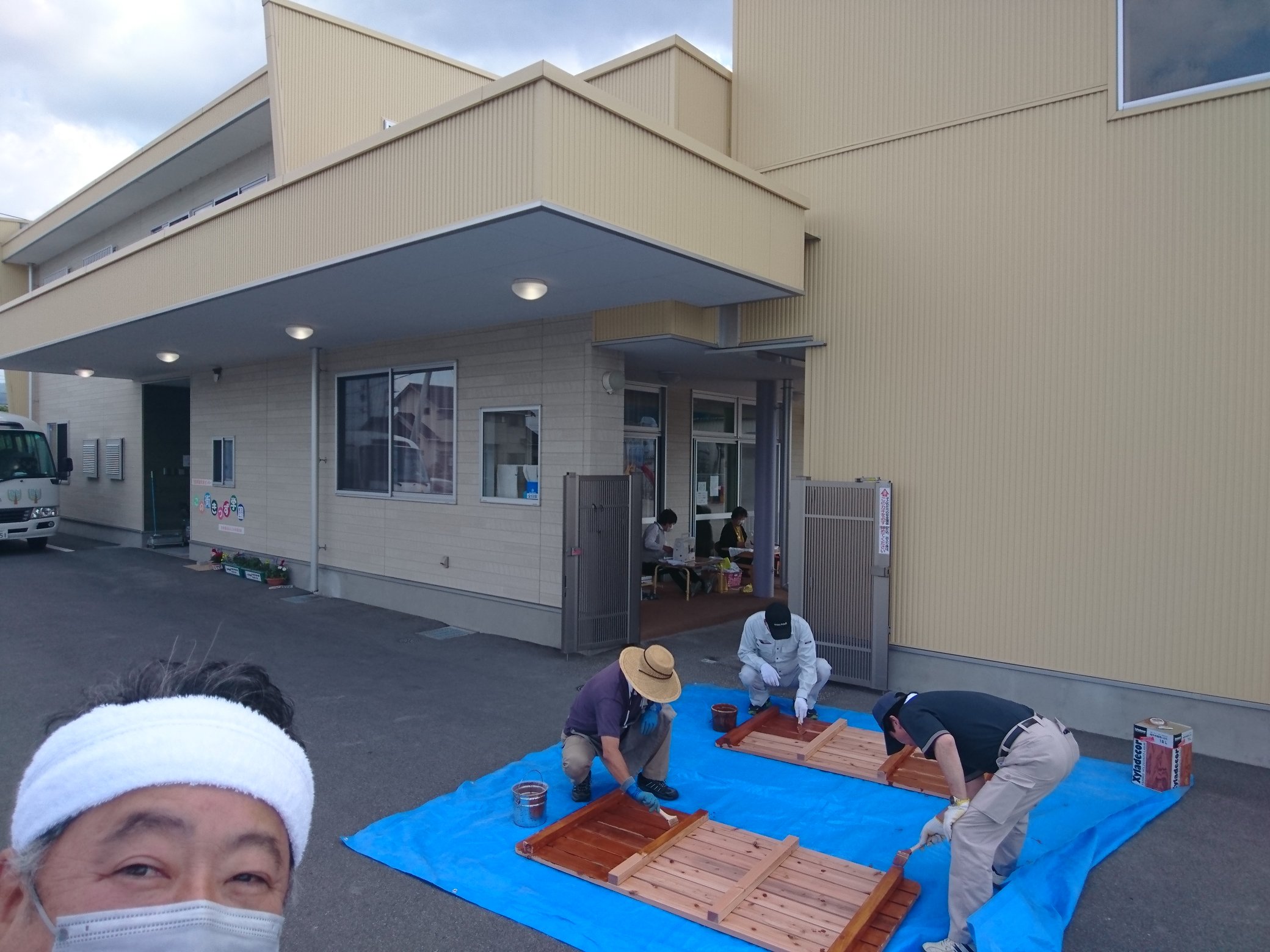 5月29日、中洲地区社会福祉協議会の方とこの街きっず学園のすのこ塗装作業のお手伝いをさせて頂きました。天気に恵まれ無事にご奉仕出来ました。