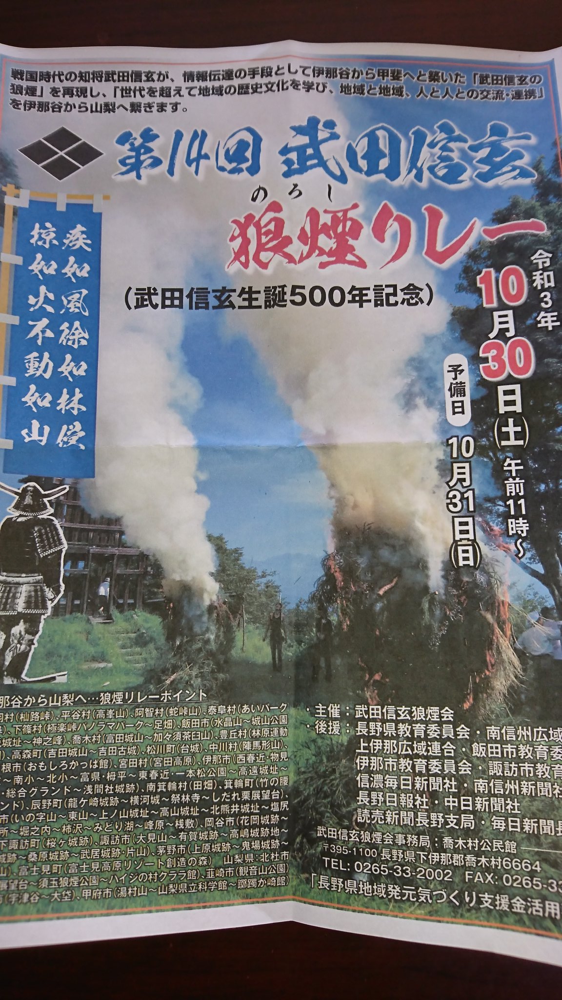 10月30日、第14回武田信玄狼煙リレーが開催されました。根羽村~甲府市へと狼煙が上がるとワクワクするのは私だけでしょうか?