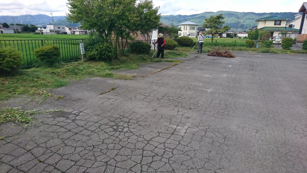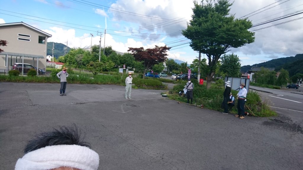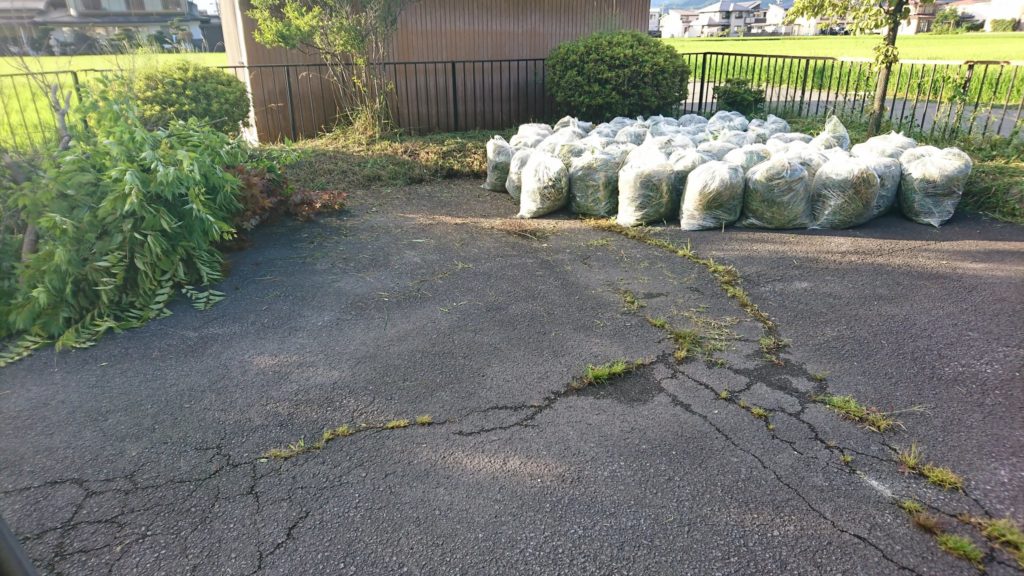 8月6日、諏訪大社上社駐車場の草刈り作業を行いました。高温多雨にていつもよりビニール袋が多いです。