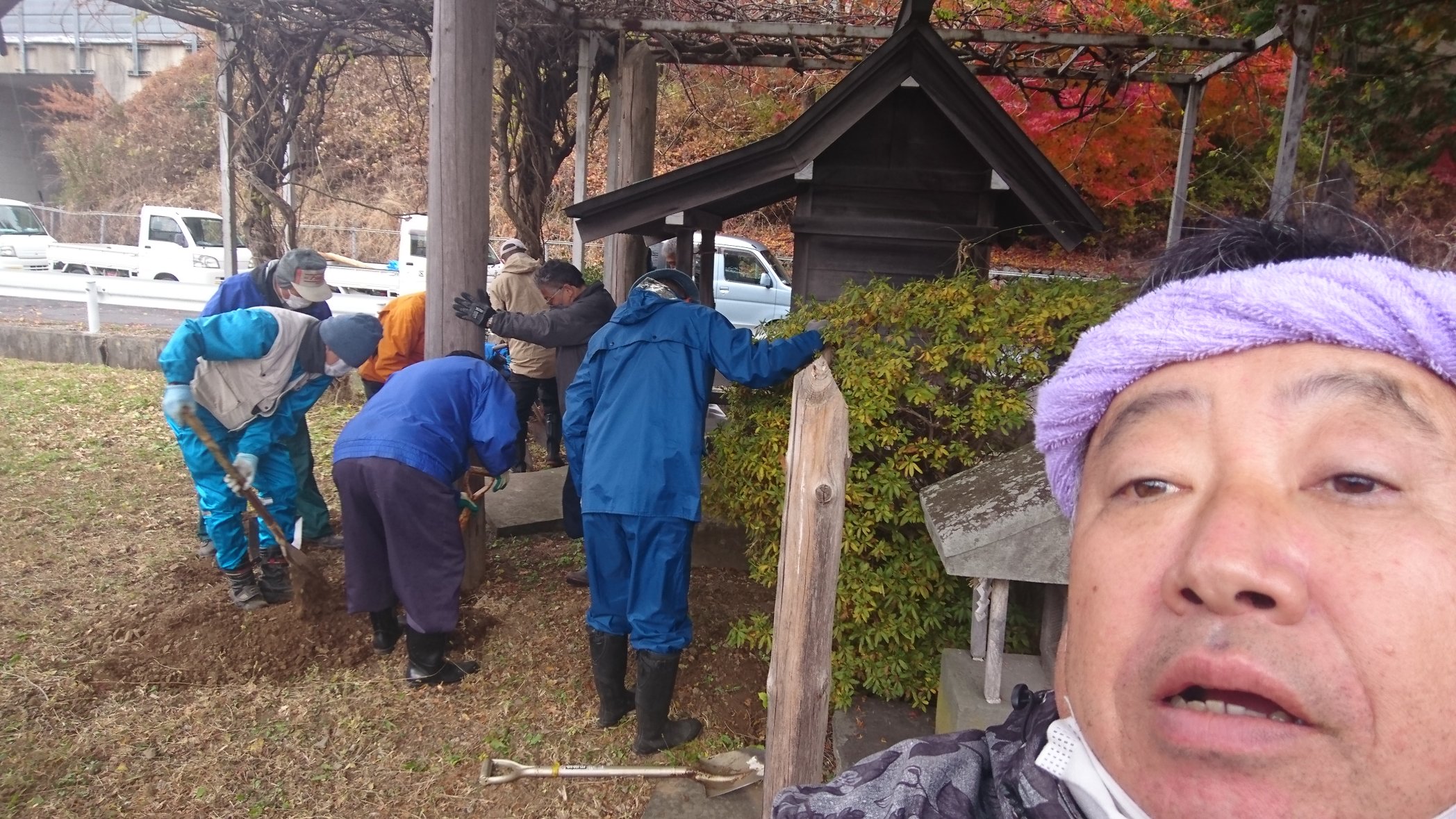 11月20日、藤島社、荒玉社の御柱休めが担当役員の皆様で行われました。25日の御柱祭に向けての準備作業となります。