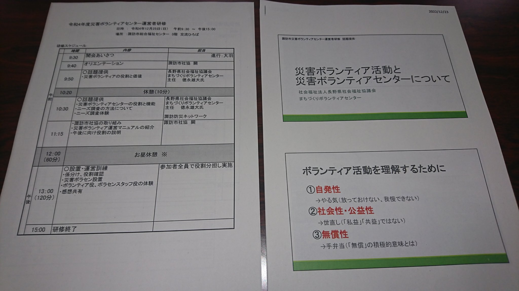 12月25日、諏訪市災害ボランティアセンター運営者研修に参加しました。設置運営訓練では、ボランティア・ボラセンスタッフ両側の課題共有する事が出来ました。
