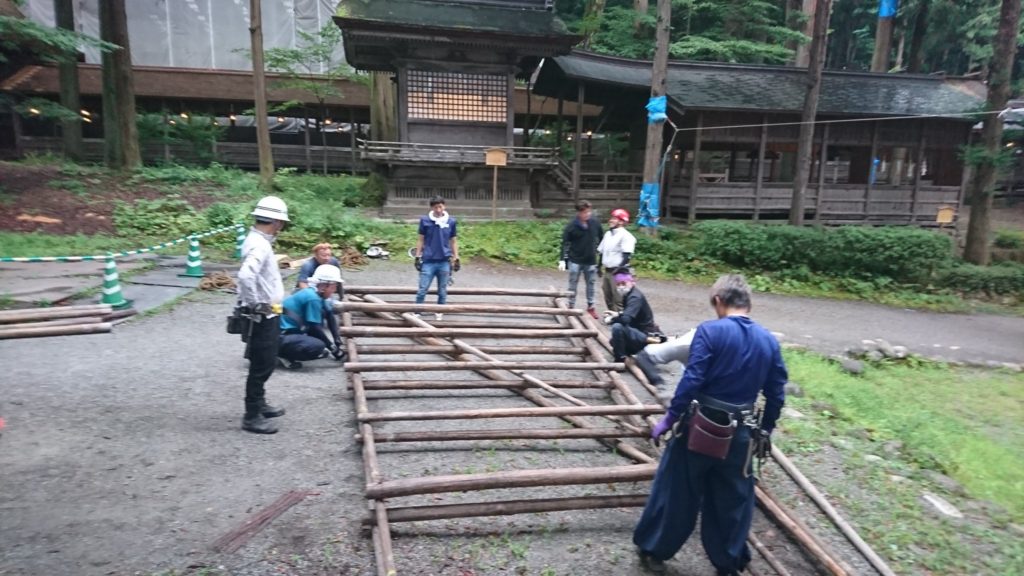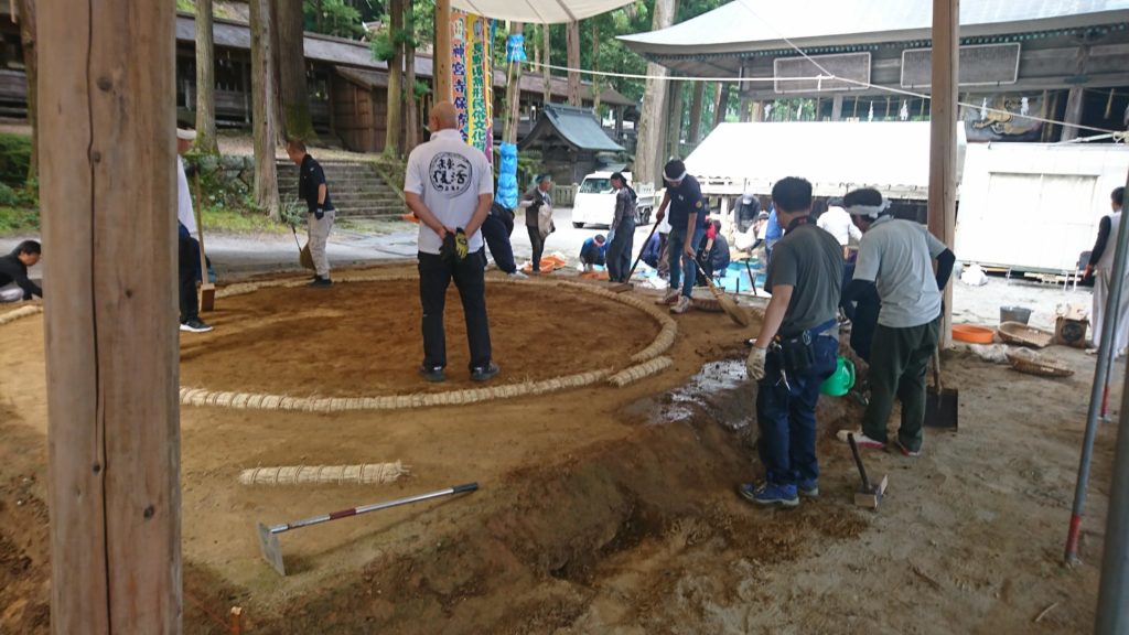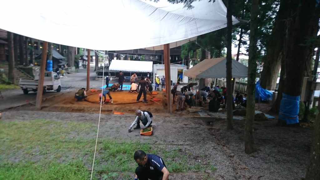 8月20日、諏訪大社上社土俵にて、十五夜奉納相撲に向け土俵作りが行われました。笠原大関をはじめ、力士・踊り子の皆様の活躍を御祈念申し上げます。