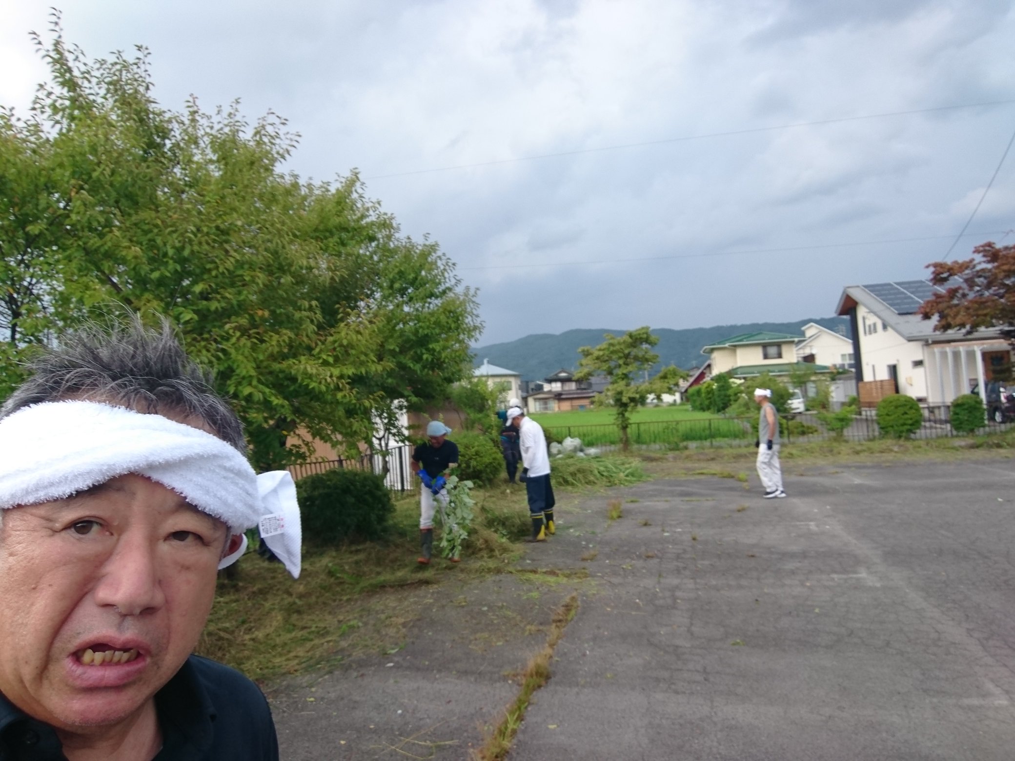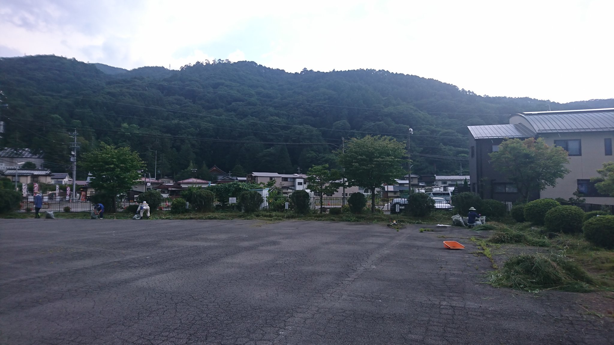 8月4日、宮ノ脇まる宮会の皆様による諏訪大社上社駐車場の草刈り作業が行われました。雷がなっていましたが、一時間程で大変綺麗になりました。