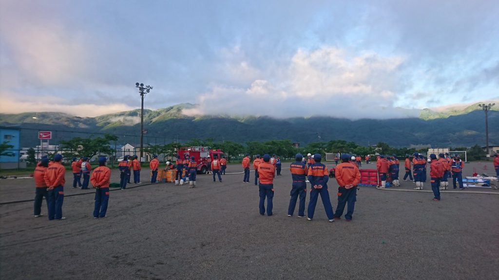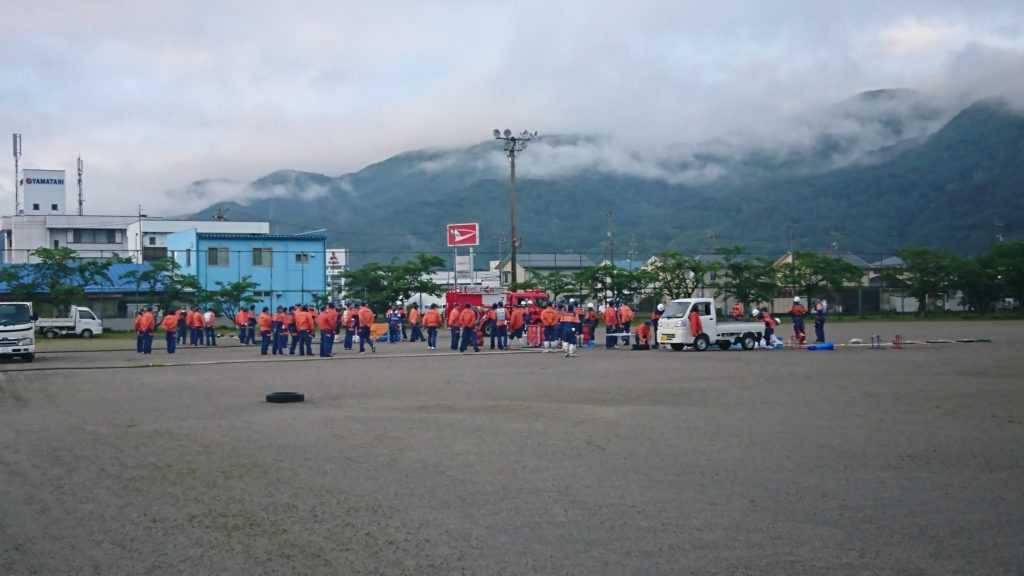 6月4日、諏訪南中学校にて行われている第7分団のポンプ操法練習の様子を見学させて頂きました。