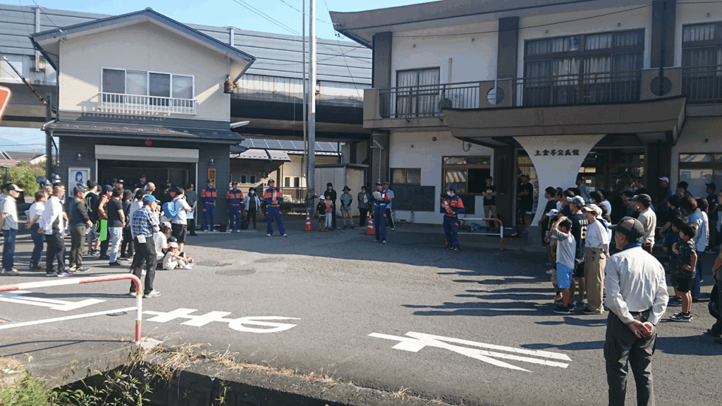 朝一には、地区公民館の地区訓練に参集し、その後主会場である諏訪南中学校へ徒歩で行きました。