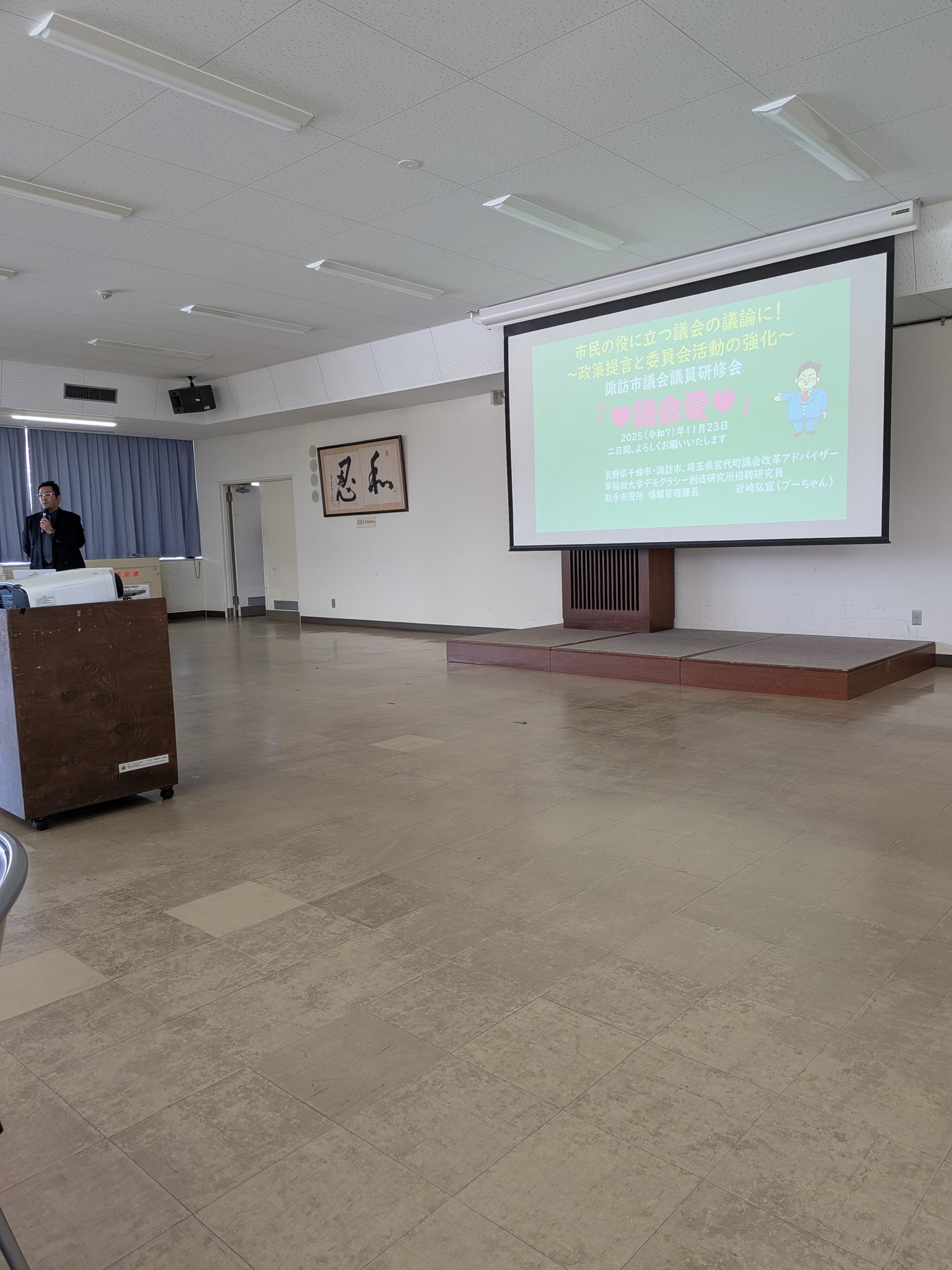 11月23,24日の2日間にわたり、諏訪市議会では岩﨑アドバイザーをお招きして研修会を行いました。政策提言と委員会活動の強化、タブレットや生成AIの活用についてでした。岩﨑アドバイザーにお礼を申し上げると共に、休日に出勤された議会職員の方々に感謝します。 FacebookXBluesky
